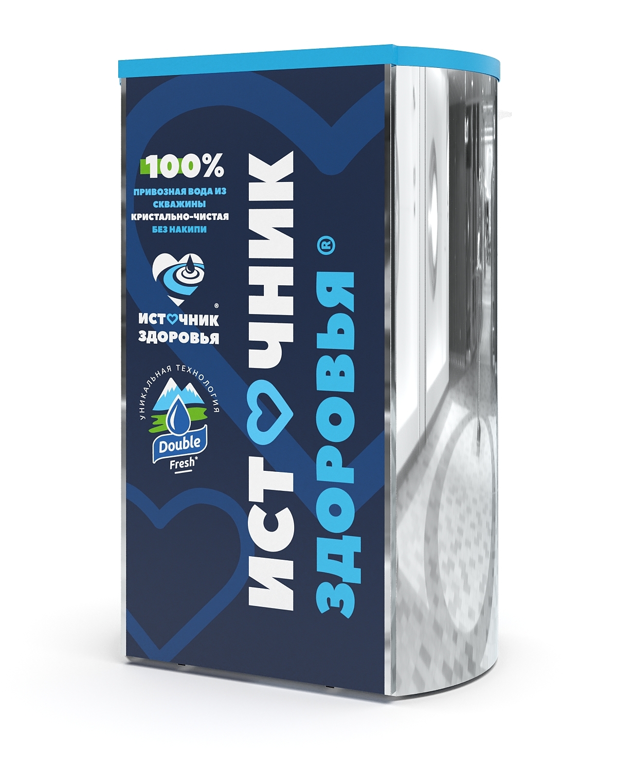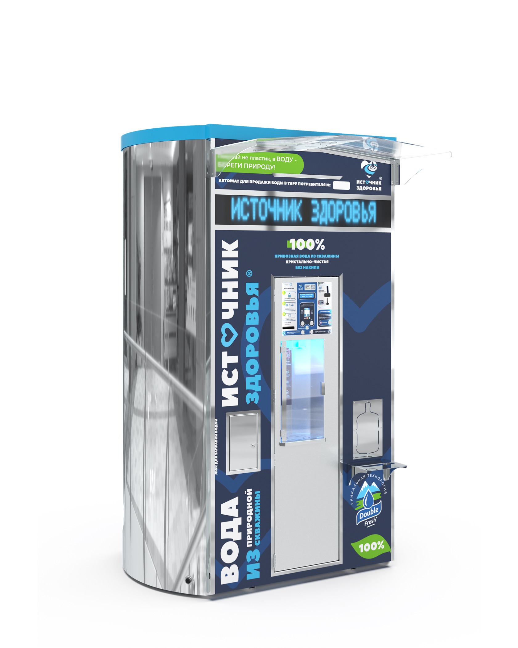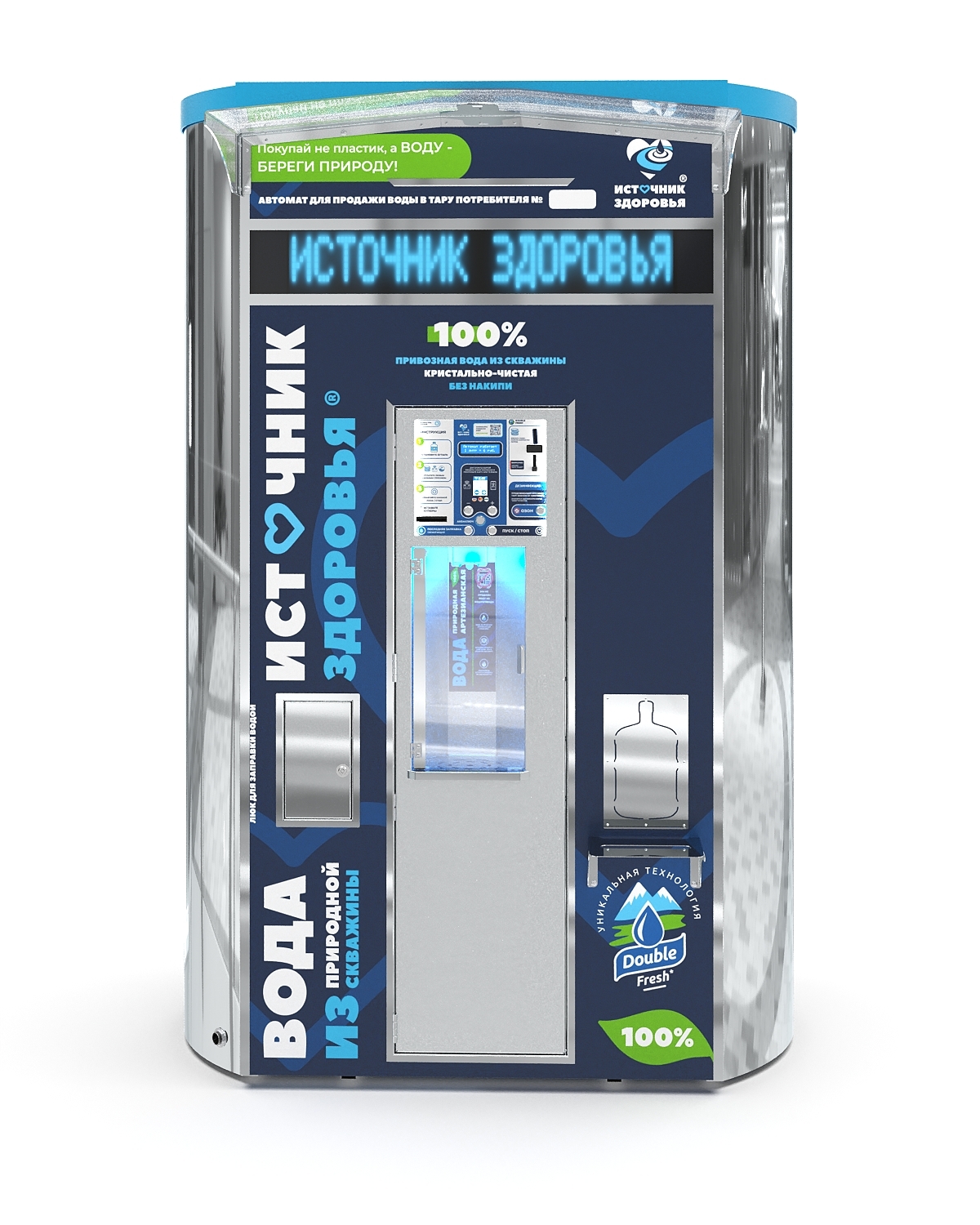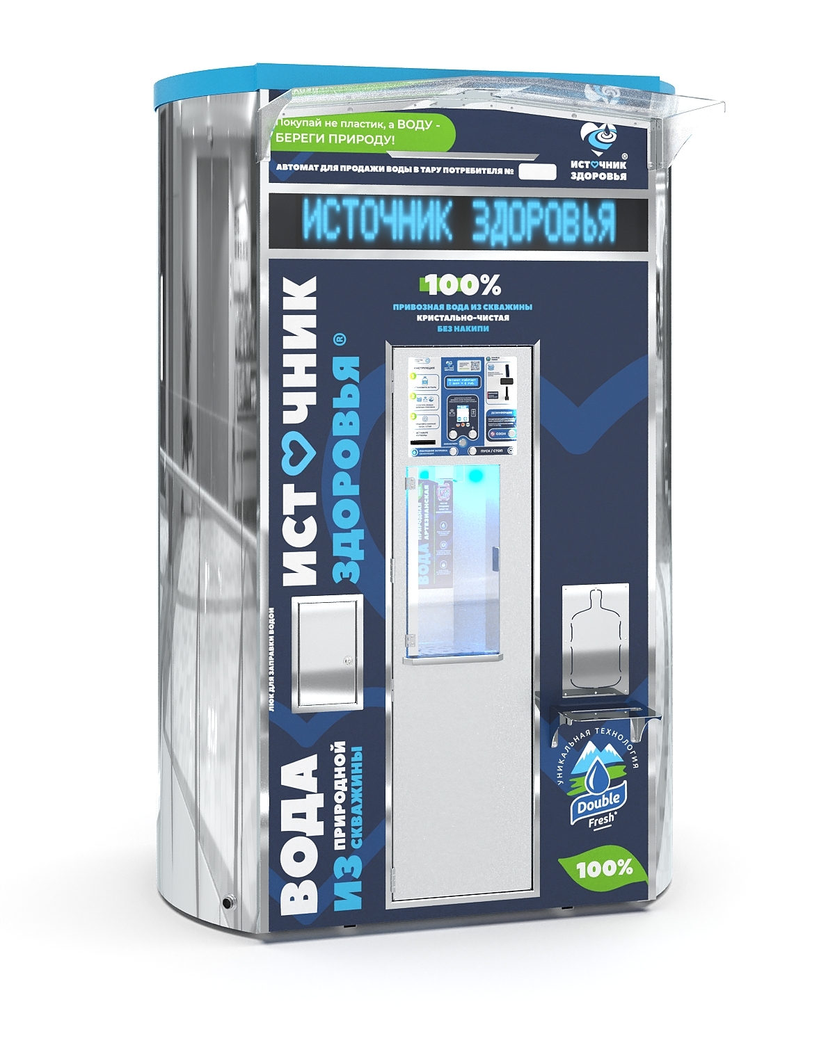 Автомат для продажи полезной артезианской воды с двумя независимыми баками. Вместимость аппарата — до 2000 литров воды. От выбора комплектации зависят дополнительные опции и возможности оборудования.